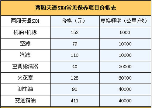 4.保养费:我们向长安铃木4S店售后服务人员咨询过,厂家规定天语SX4的首保时间为两个月或者1500~2500公里(以先到为准),正常保养周期为5000公里,假设一年跑2万公里,一年则需要做保养4次。第一次常规保养(只更换机油机滤,首保免费)费用为152元;第二次(更换机油机滤+空气滤芯+汽油滤芯)为341元;第三次常规保养(更换机油机滤)152元;第四次(更换机油机滤+空气滤芯+汽油滤芯+变速箱油)为411元,此外空调滤芯3万公里更换,刹车油4万公里更换,那么2年/4万公里的保养费用为2242元,平均一年两万公里需花费为1121元左右。