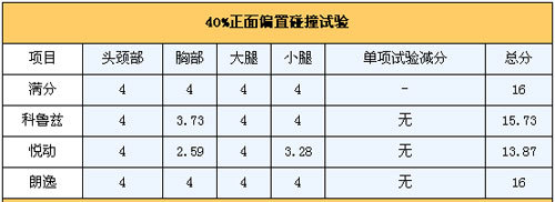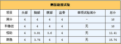 侧面碰撞让悦动与另外两个对手拉开了差距,胸部保护得分仅仅为0.81分,让人难以接受,也让它远离了五星级的安全评价。同时科鲁兹在这里获得了满分,朗逸的表现也很优秀,同样在胸部保护上丢了些许分数。