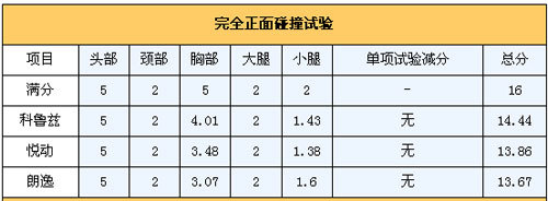 我们看到,在这一组实验当中,上海大众旗下的畅销家用车朗逸得到了16分满分的好成绩,捍卫了德系车在安全性上的荣誉,而悦动则表现较差,尤其是在胸部保护上紧紧得到了2.59分,让人有些担忧。科鲁兹的表现也很不错,仅在胸部保护上有所失分,让我们对这款雪佛兰全球战略车型充满期待。