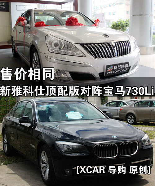 韩国现代的雅科仕,上市10年,是韩国现代旗下的最高等级的车。此次引进我国的,是最新款的雅科仕。这款车子装备3.8和4.6升两种排量的发动机,每种发动机都有豪华版和尊享版两个款式,起步售价为67.7万元,4.6升的尊享版为最高配置的车型,售价91万元。也就是说,宝马7系中的最低车型正好与雅科仕的最高车型售价相当。