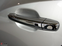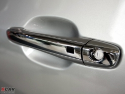 修长的全镀铬的车门把手,金属感很强,拉动开启手感非常柔和舒适。黑色的橡胶小按钮大小和软硬适中,是感应钥匙的开锁按钮。门把手上唯一的不足就是钥匙机械锁孔,往里凹陷的圆孔直接暴露在外,时间长了内部有生锈的可能,同时容易积聚灰尘影响美观。